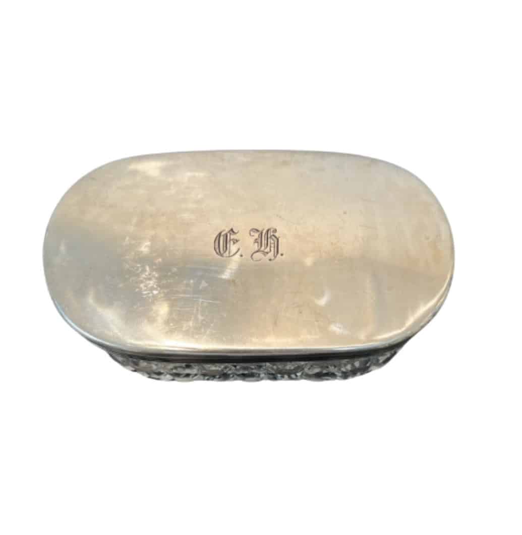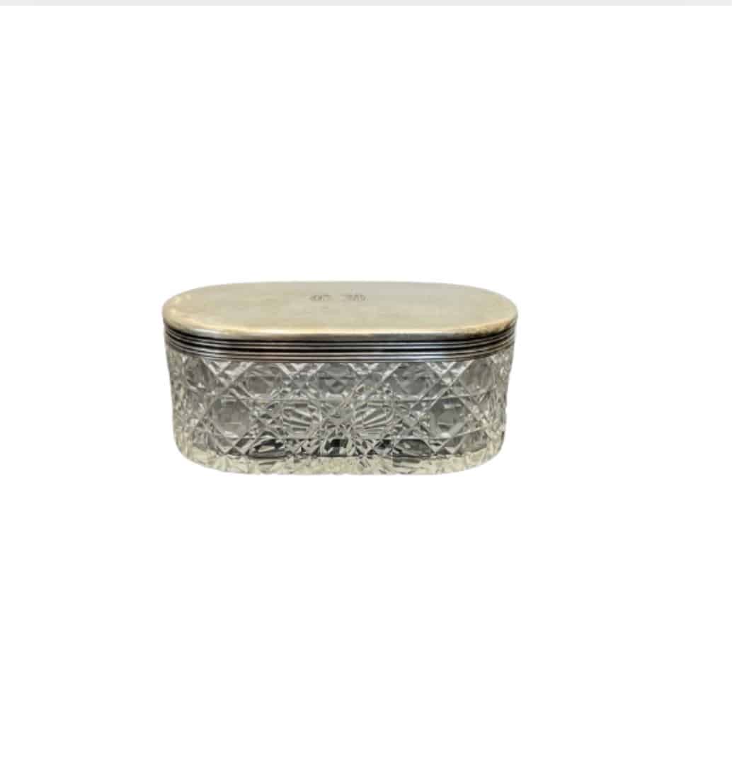 Tyylikäs vintage-kristallirasia hopea kannella on sekä käytännöllinen että näyttävä sisustusesine. Hienostuneesti hiottu kristalli heijastaa valoa kauniisti, ja sileä, elegantti jalometallikansi viimeistelee kokonaisuuden.