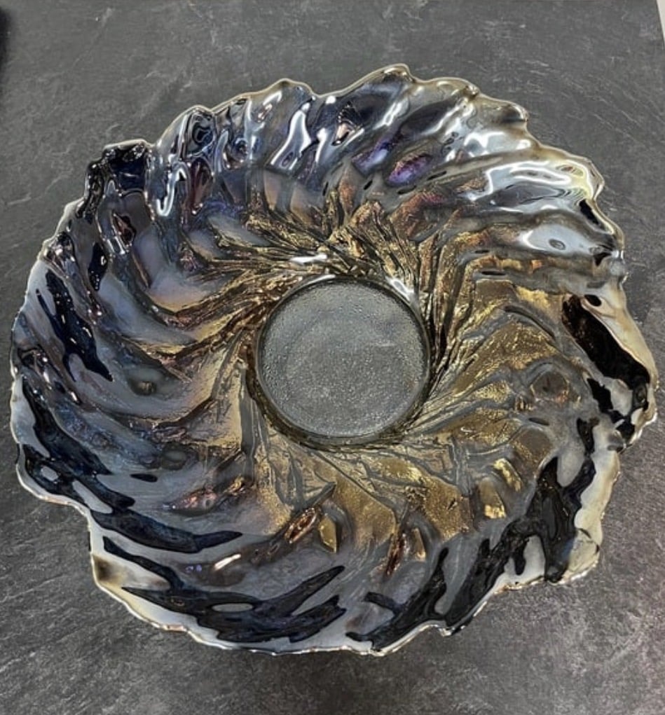 Sen aaltoileva, orgaaninen reuna ja metallinhohtoinen pinta tekevät siitä näyttävän sisustuselementin, joka vangitsee katseen valon osuessa lasin pintaan eri kulmista.