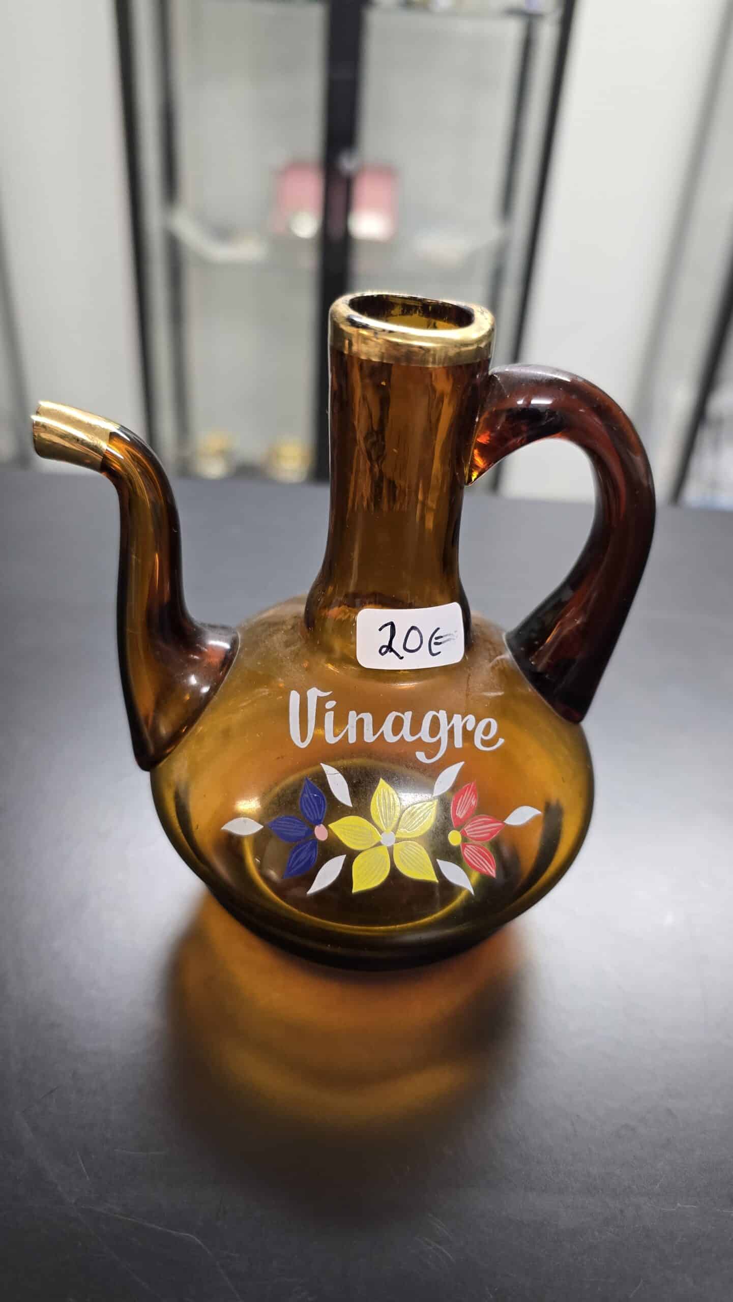 Kaunis vintage-tyylinen lasinen etiketti “Vinagre” -pullo. Ruskeasta lasista valmistettu kaadin on koristeltu värikkäillä kukkakuvioilla ja tuo ripauksen retrohenkeä keittiön sisustukseen. Täydellinen etikkapulloksi, oliiviöljylle tai koristekäyttöön. Sopii hyvin myös lahjaksi vintage- ja keittiöesineiden ystävälle.